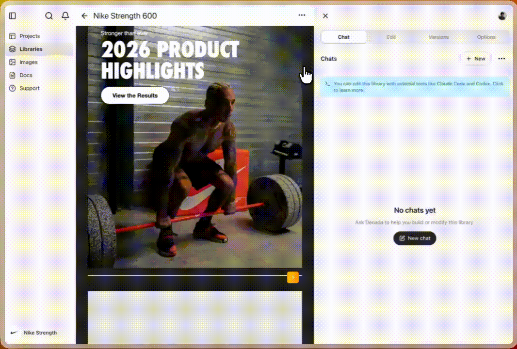 Now you can park your templates in Denada and use AI—either directly in Library Chat or through tools like Codex, Claude, or Gemini CLI—to iterate and improve them instantly.